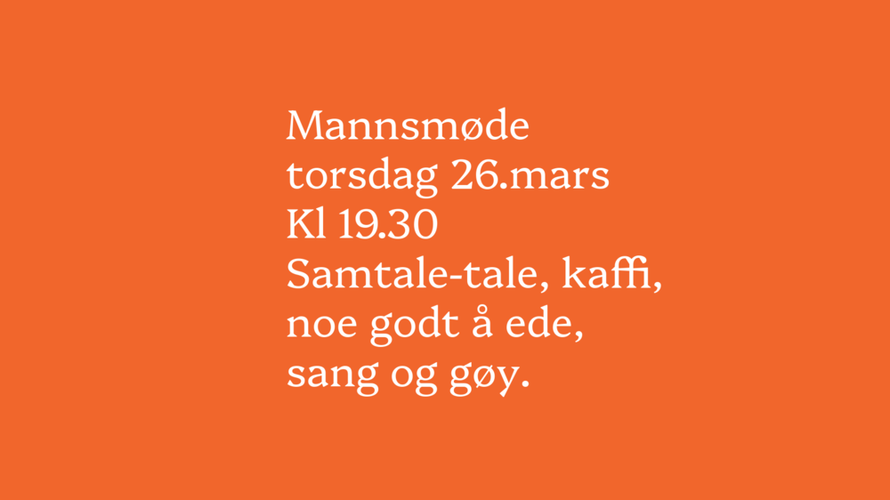 Velkommen til mannsmøde kl 19.30 torsdag 26. mars. I kafe Beden. Det blir noe mat, innhold, moro og sang.